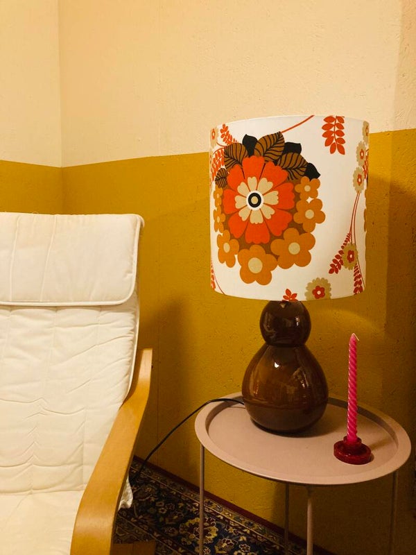 Deze karaktervolle tafellamp combineert nostalgische charme met eigentijdse flair. De kap is zorgvuldig met de hand gemaakt van originele vintage stof uit de jaren 70, met een opvallend bloemenpatroon in warme oranje- en bruintinten. De keramieken voet heeft een glanzende, chocoladebruine afwerking en een sierlijke, bolle vorm die doet denken aan retro designklassiekers. Met een hoogte van ongeveer 80 cm en een kapdiameter van 25 cm is deze lamp niet alleen functioneel, maar ook een uitgesproken sfeermaker in elk interieur. Perfect voor liefhebbers van vintage, design en ambachtelijk gemaakte woonaccessoires.