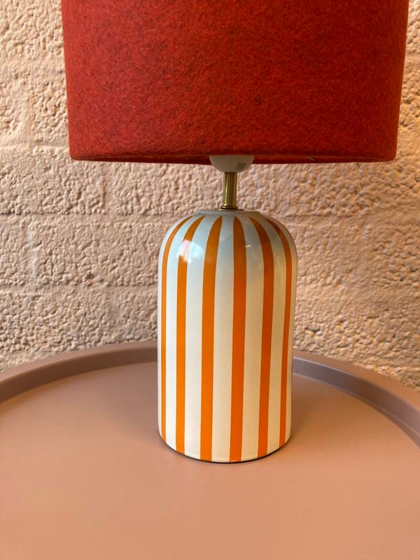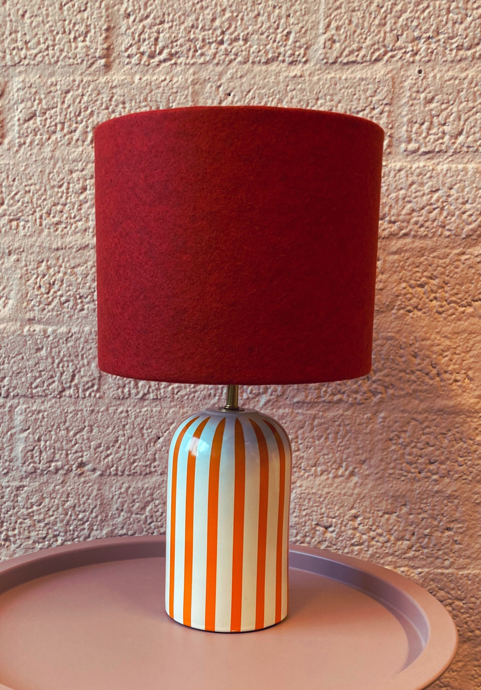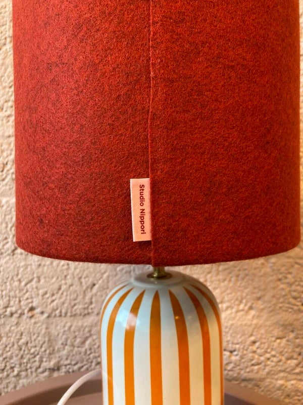 Breng kleur, karakter en warmte in je interieur met deze unieke design tafellamp van Studio Nippori. De lamp combineert een opvallende vilten lampenkap in de kleur Asianrood met een keramische voet met oranje-witte retrostrepen, geïnspireerd op de jaren 70. De kap is vervaardigd uit hoogwaardig wolvilt en heeft een warme koper-gouden binnenkant die het licht sfeervol weerkaatst.