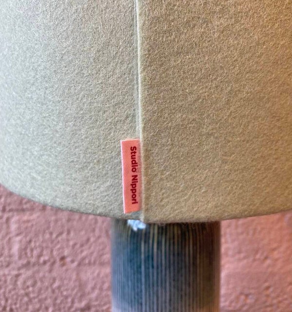 Breng rust en verfijning in je interieur met deze unieke tafellamp van Studio Nippori. De handgemaakte lampenkap is uitgevoerd in hoogwaardig jadegroen wolvilt en heeft een warme koper-gouden binnenzijde die het licht sfeervol verspreidt. De keramieken voet is elegant geglazuurd en loopt subtiel over van donkergroen naar crème, wat zorgt voor een verfijnd en harmonieus kleurenpalet.