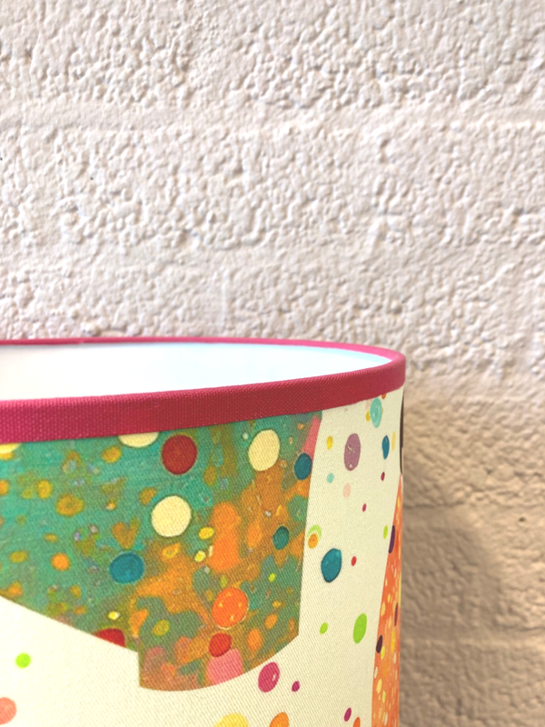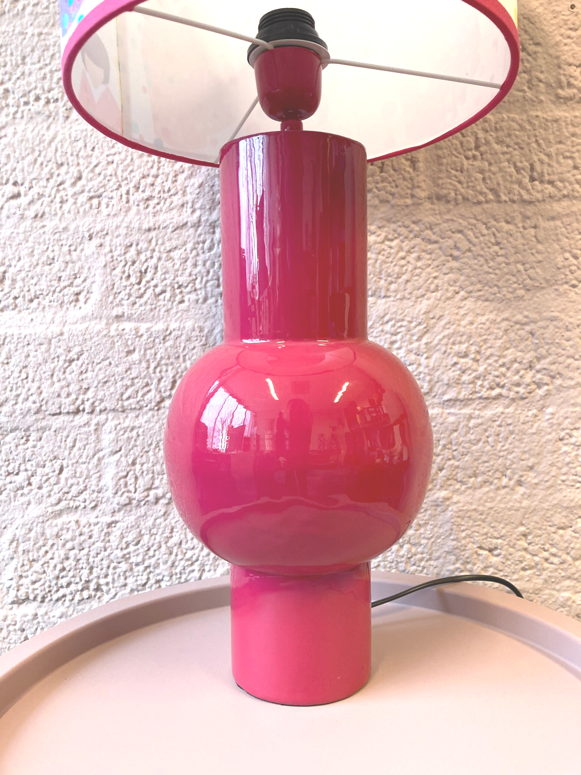 Deze bijzondere lamp is een echte eyecatcher voor je interieur! De bolvormige voet is van metaal en heeft een opvallende magenta kleur. De handgemaakte lampenkap is bekleed met een hoogwaardige stof met een kleurrijke geisha-print op een beige achtergrond. Boven- en onderrand zijn afgewerkt met een bijpassende magenta bies, wat zorgt voor een mooie eenheid in kleur en stijl.
